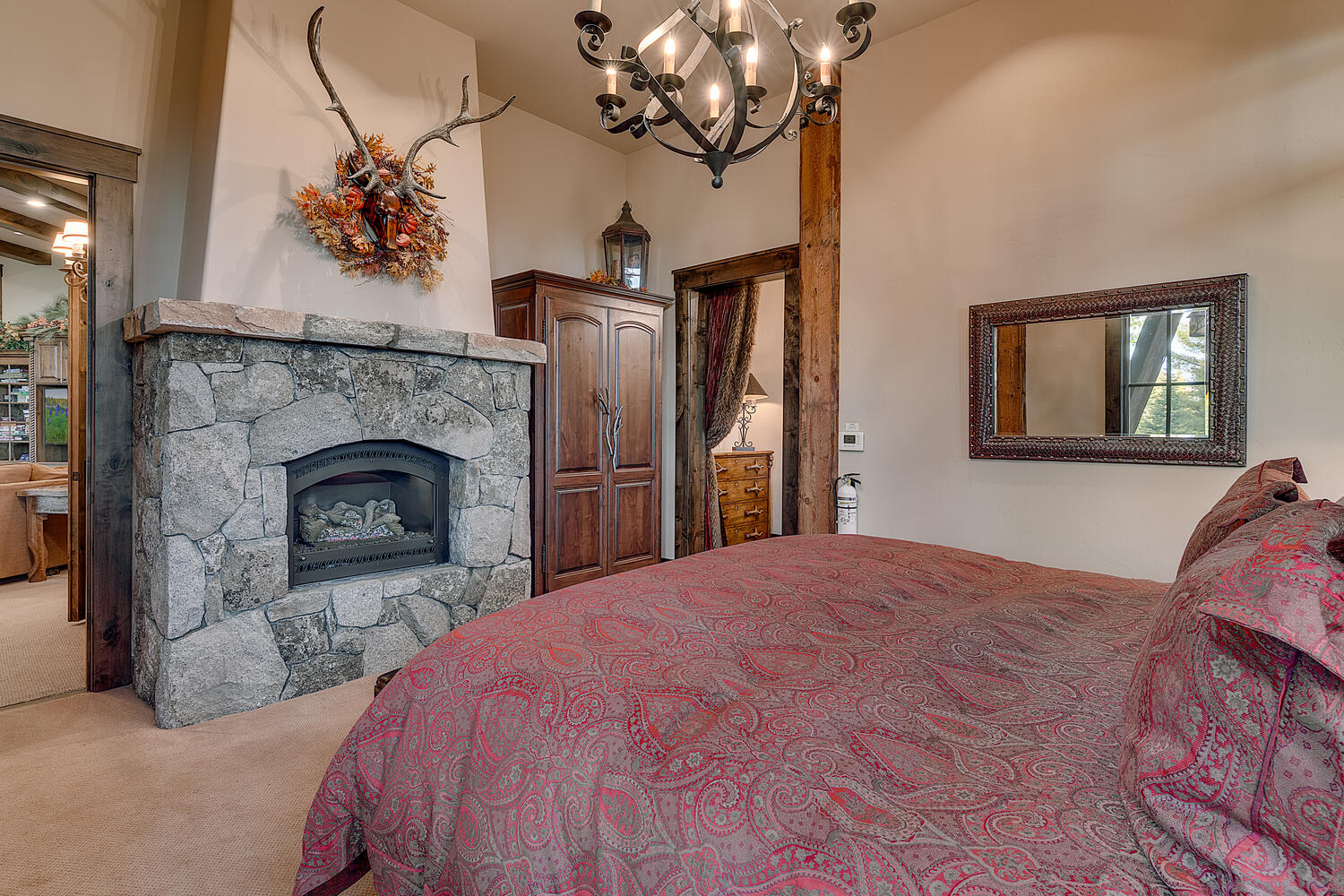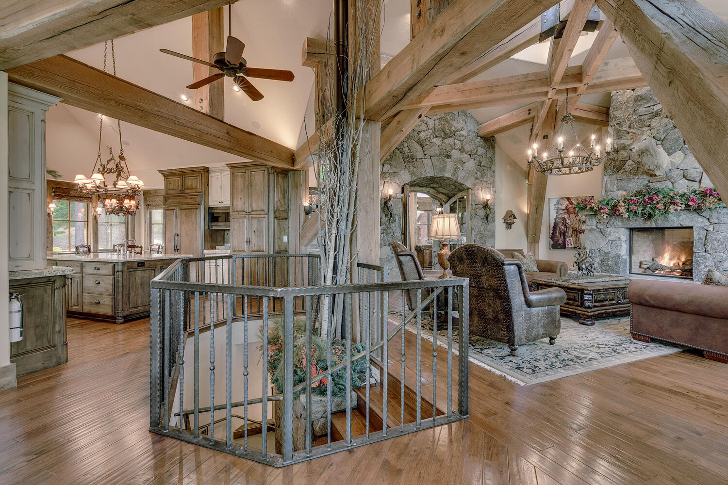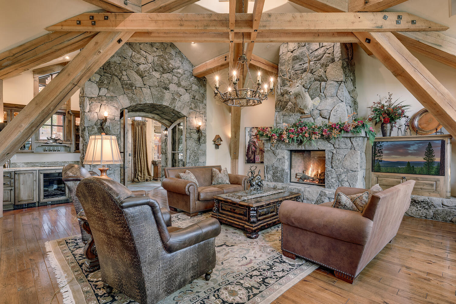 Inside, the home impresses at every turn with grand, oversized living spaces and meticulous custom details like hand-painted walls. The liviing room features a soaring 24-foot trestle-beamed ceiling, massive stone archways, and a striking fireplace that anchors the room with mountain elegance. A gourmet chef’s kitchen, formal and informal dining areas, and a wet bar off the living room creates a seamless atmosphere for elevated living and effortless entertaining.