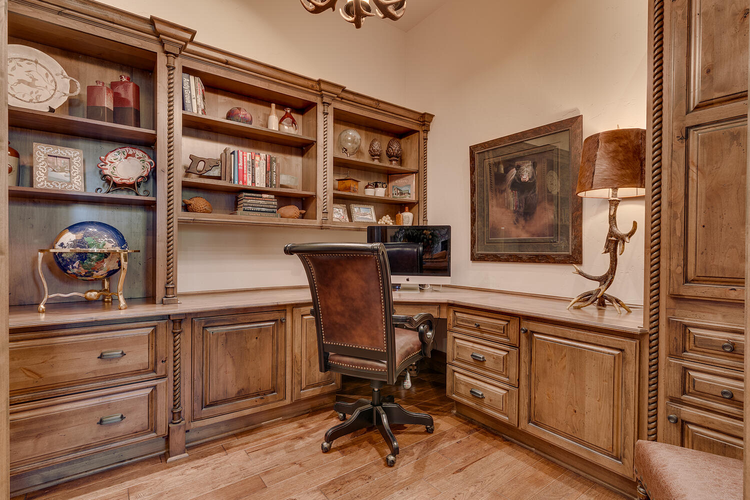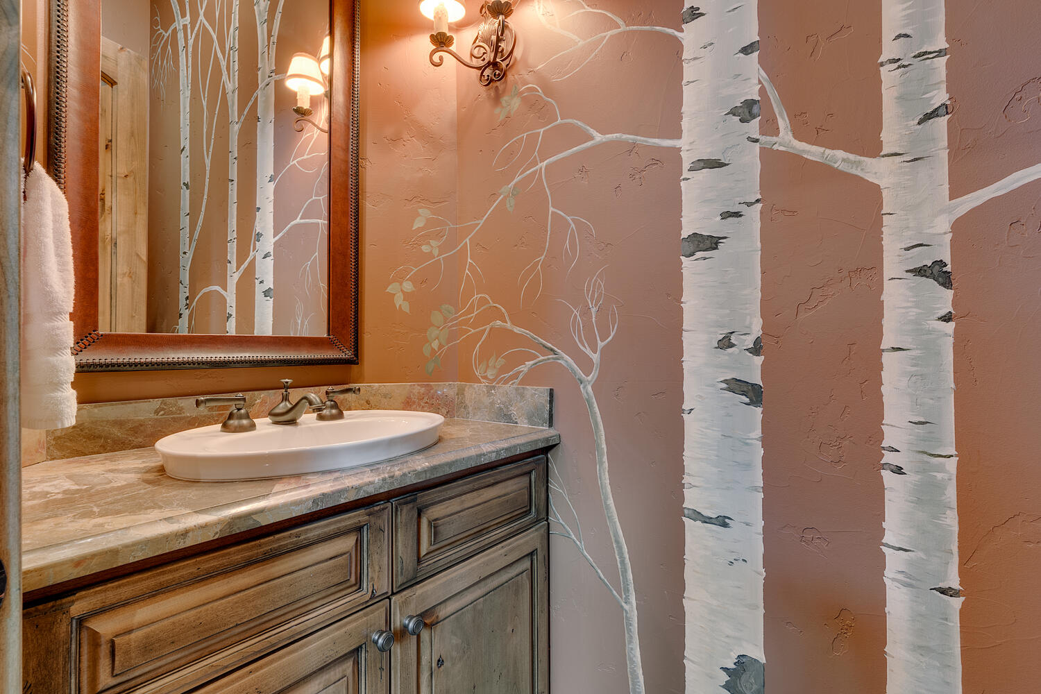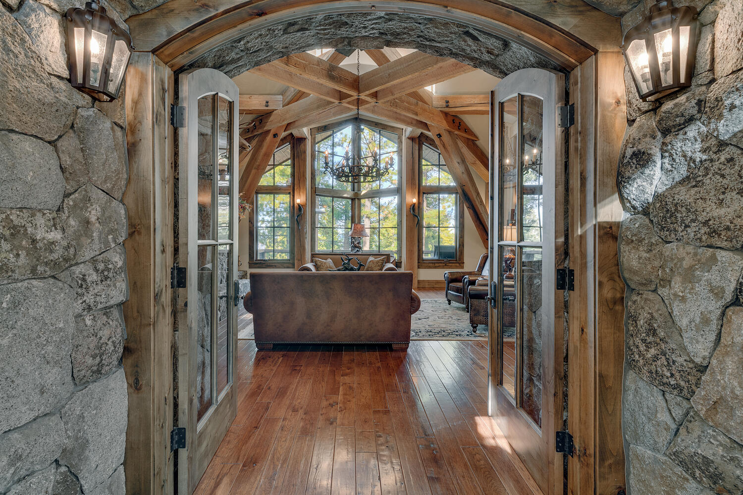 Inside, the home impresses at every turn with grand, oversized living spaces and meticulous custom details like hand-painted walls. The liviing room features a soaring 24-foot trestle-beamed ceiling, massive stone archways, and a striking fireplace that anchors the room with mountain elegance. A gourmet chef’s kitchen, formal and informal dining areas, and a wet bar off the living room creates a seamless atmosphere for elevated living and effortless entertaining.