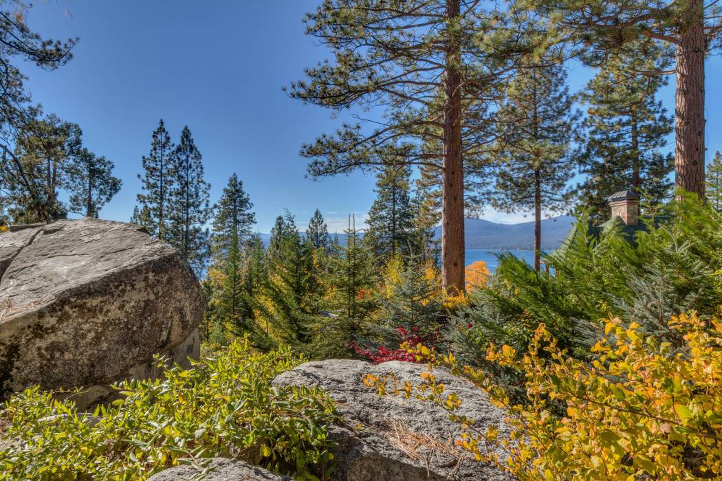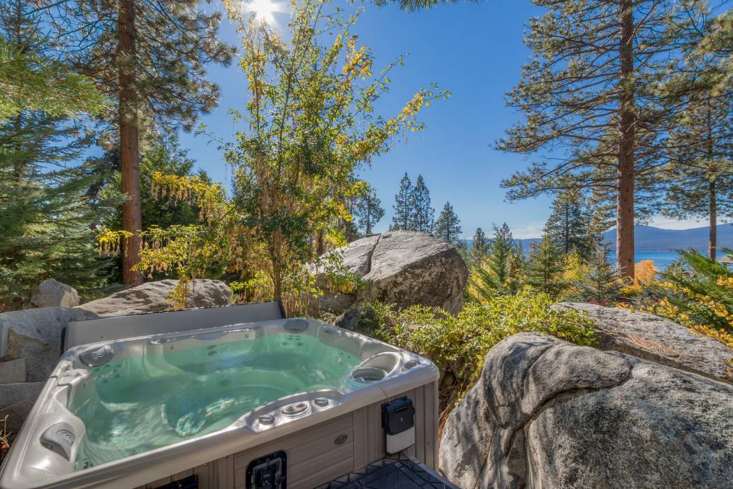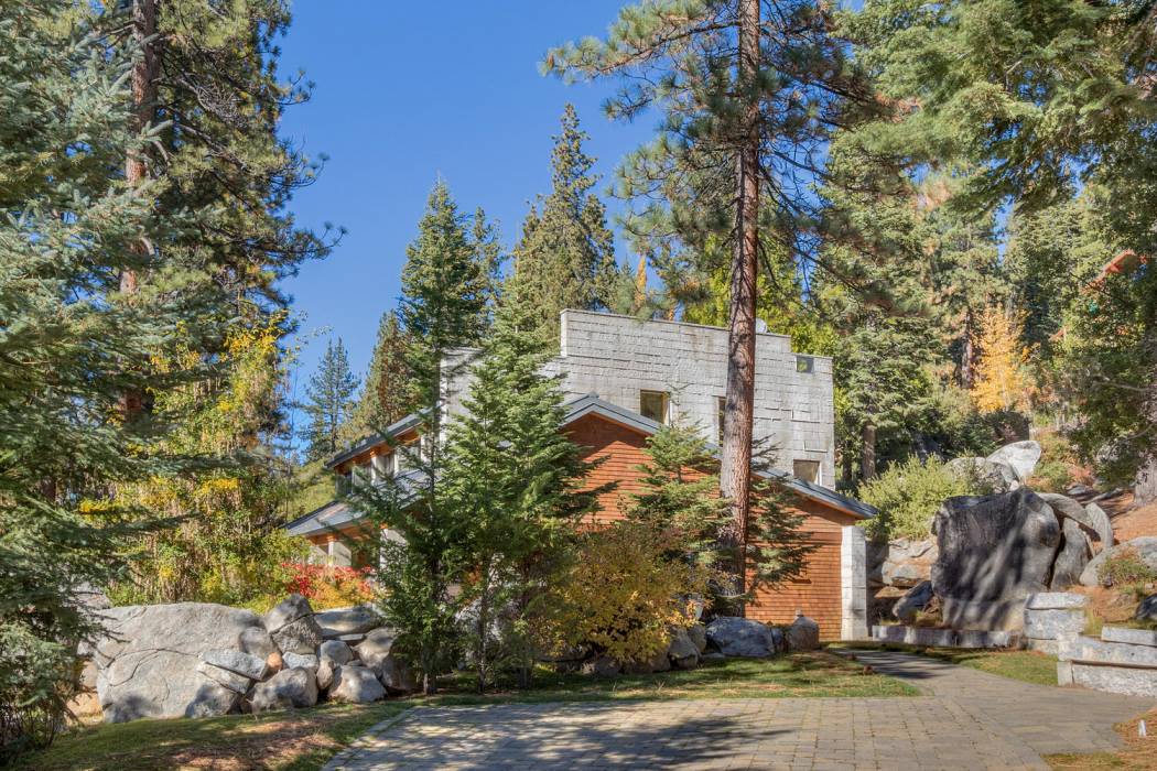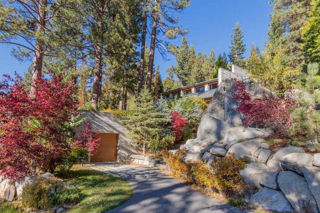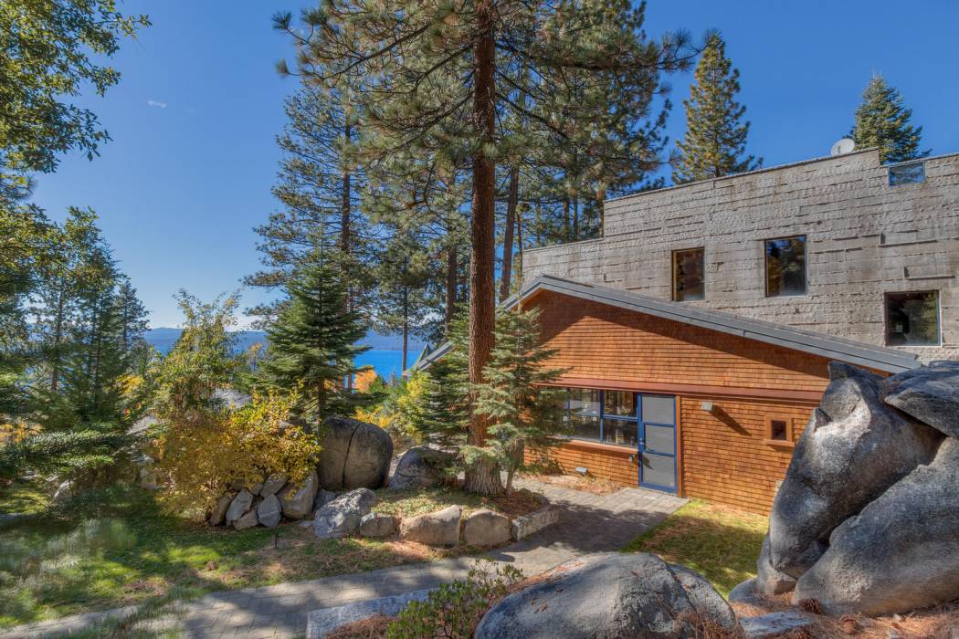 This stunning home in the coveted, gated community of Brockway Springs is a calming blend of contemporary styling set among large boulders and soaring trees. Lake views abound through the wall of windows. Intimate nooks of outdoor delight include a hot tub set within boulders, a covered porch, and a patio with a gas fire pit.