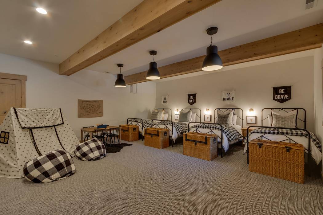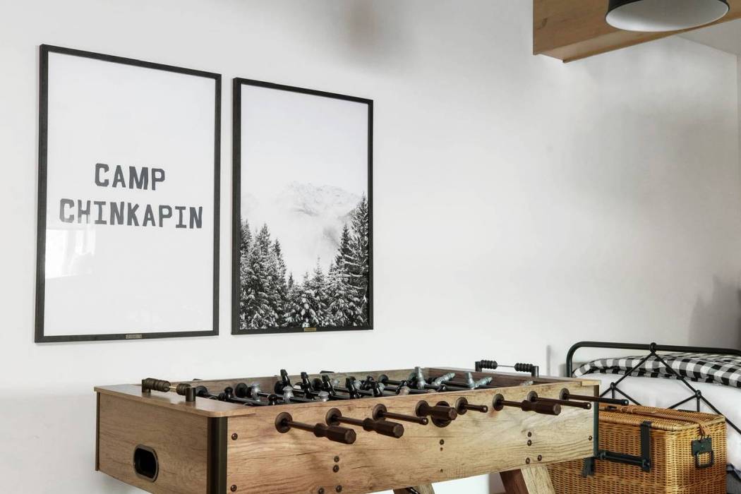 Entertainment abounds for guests of all ages. Dine al fresco under the stars. Retreat to the spacious family room downstairs, perfect for cozy movie nights. Or soak in the hot tub under the alpenglow sky. A sumptuous primary suite with a spa bath is on the main living floor. The pièce de résistance lies in the kids' room, offering ample space for play, a foosball table, and four snug twin beds.