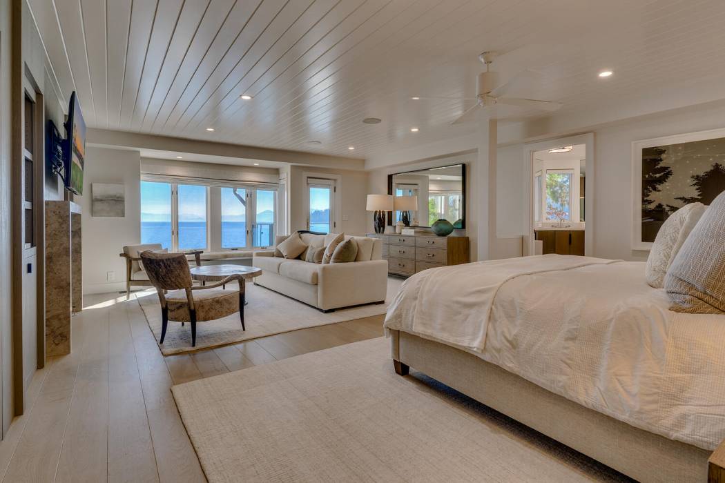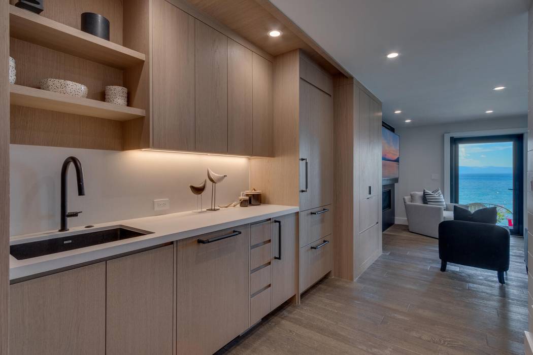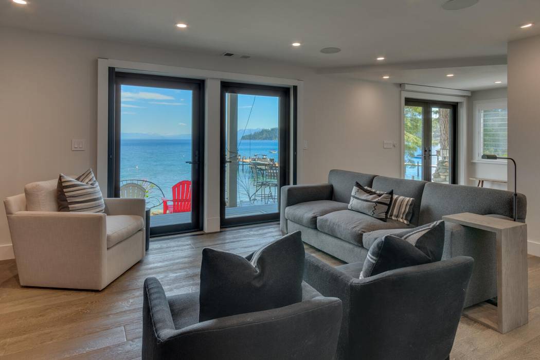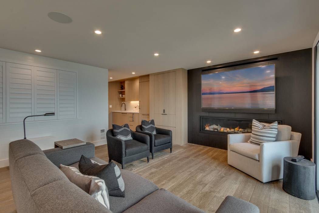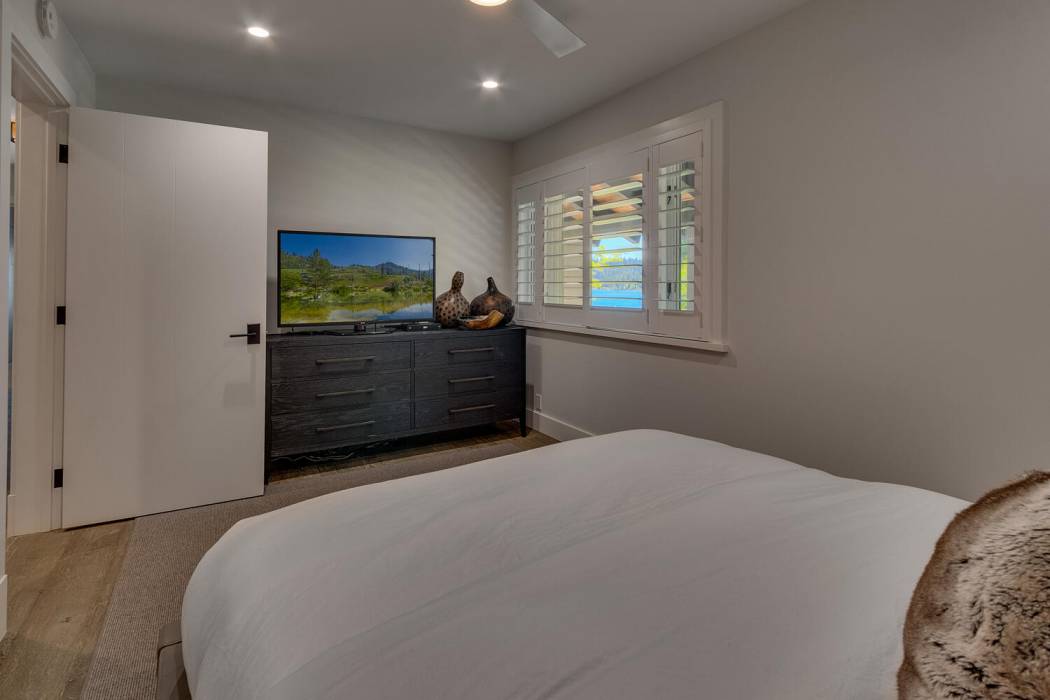 On the lower level, a fully self-contained guest suite offers exceptional privacy and convenience, complete with a wet bar, refrigerator and freezer, gas fireplace, television area, and full bathroom. Sliding doors open to the lower patio, providing easy access to the lake. Outside, a hot tub invites you to unwind under Tahoe’s star-filled skies.