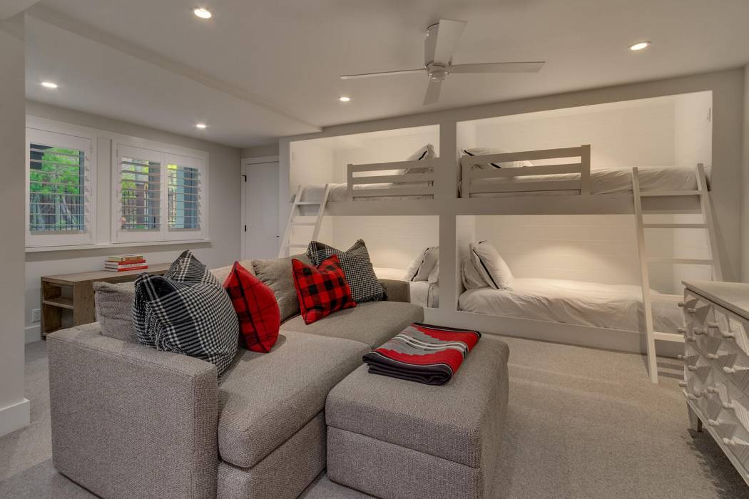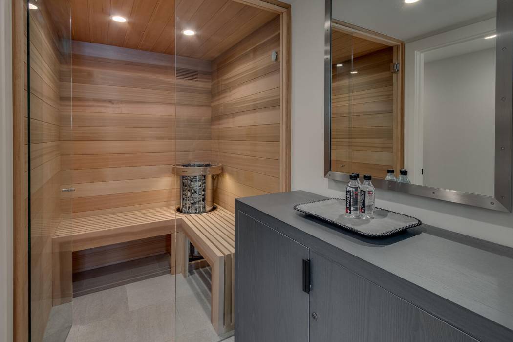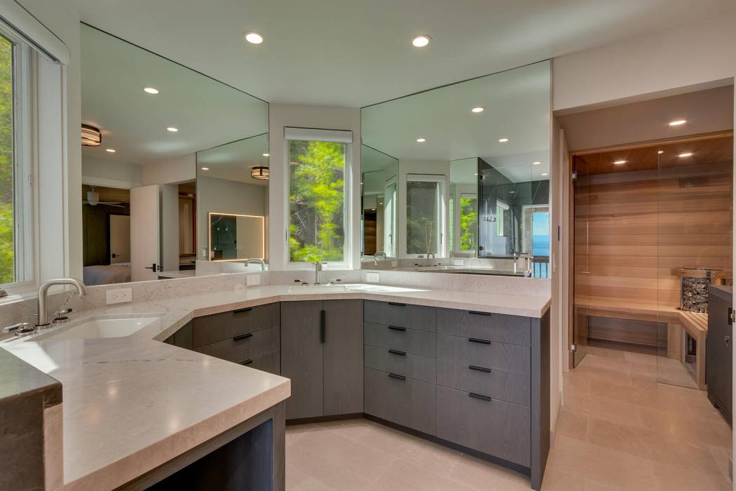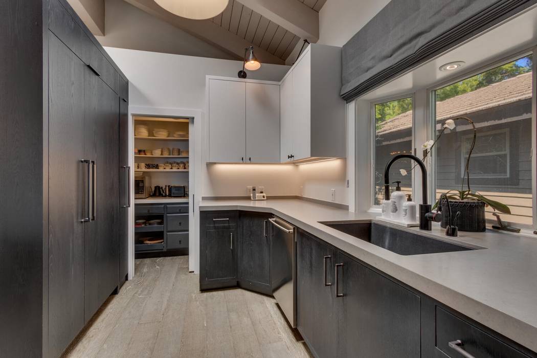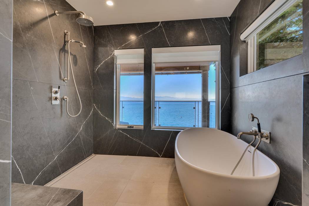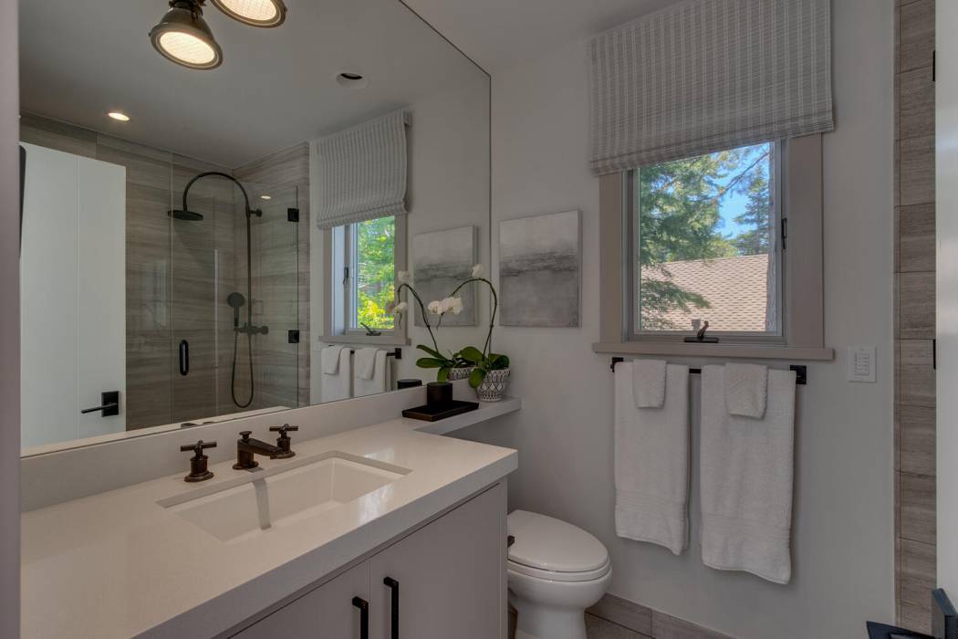 On the lower level, a fully self-contained guest suite offers exceptional privacy and convenience, complete with a wet bar, refrigerator and freezer, gas fireplace, television area, and full bathroom. Sliding doors open to the lower patio, providing easy access to the lake. Outside, a hot tub invites you to unwind under Tahoe’s star-filled skies.