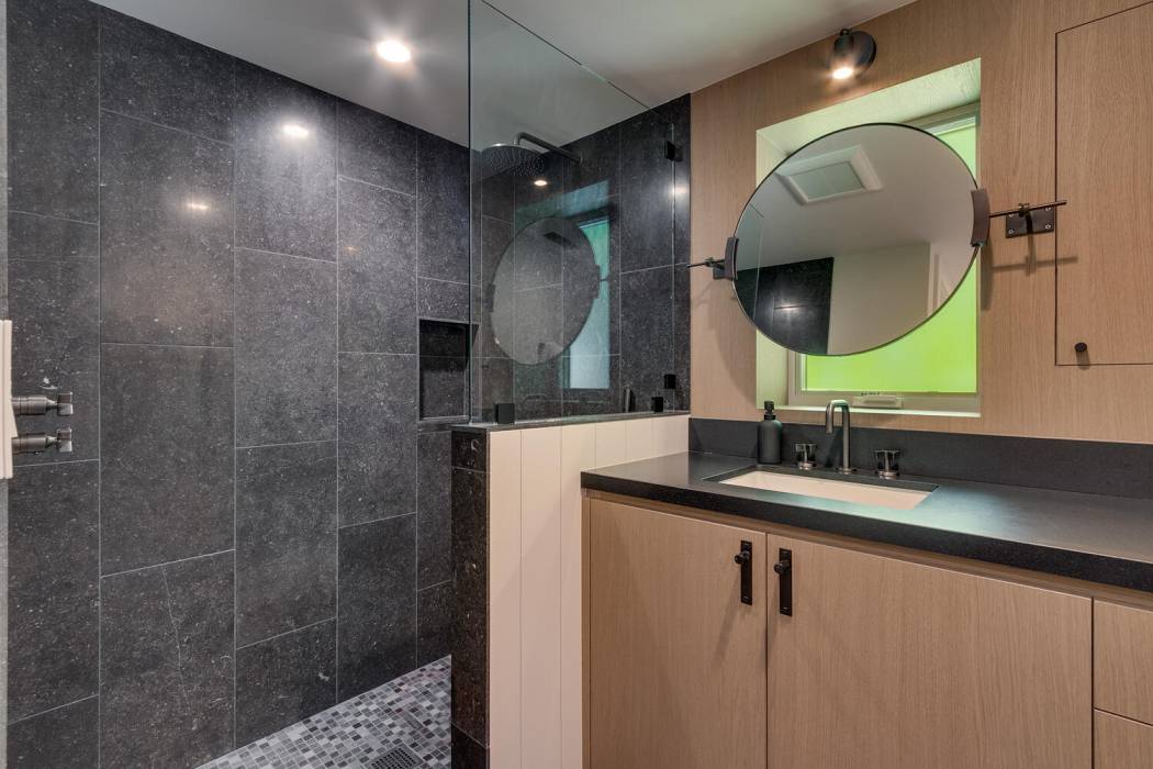 The main level is dedicated to comfort and relaxation, highlighted by the expansive primary suite. This private retreat includes a spacious sitting area complete with a gas fireplace and direct access to an outdoor deck. The spa-inspired en-suite bathroom features dual circular vanities, an oversized soaking tub, walk-in shower, and sauna. Two additional bedrooms are also located on this level, including a unique suite with two sets of built-in bunk beds and space for a secondary living area, making it ideal for hosting family and friends.
