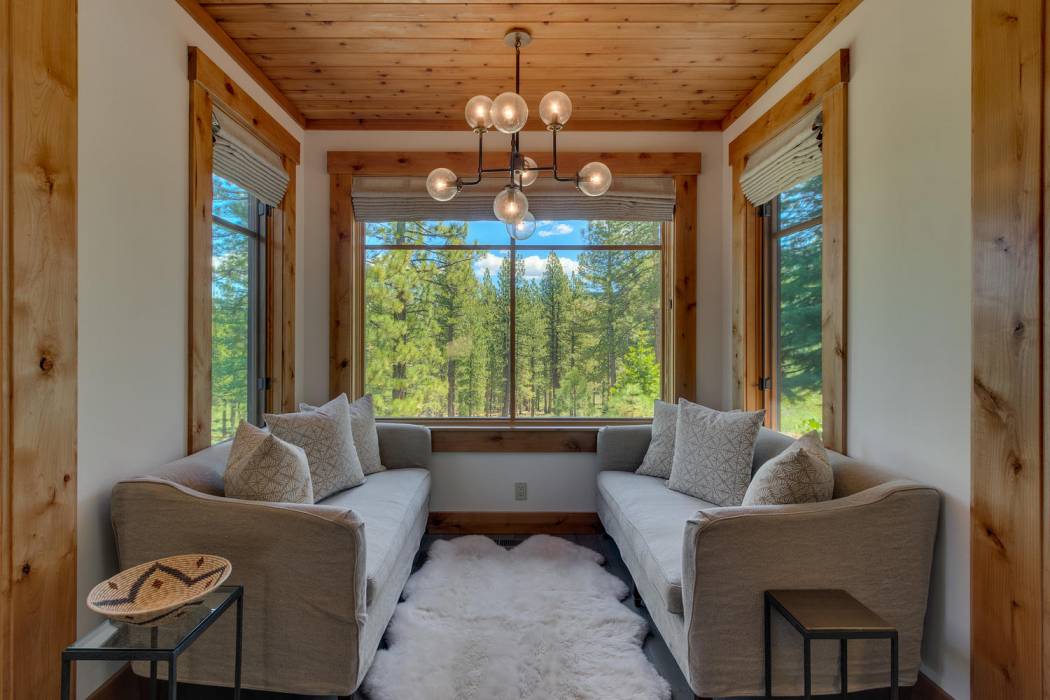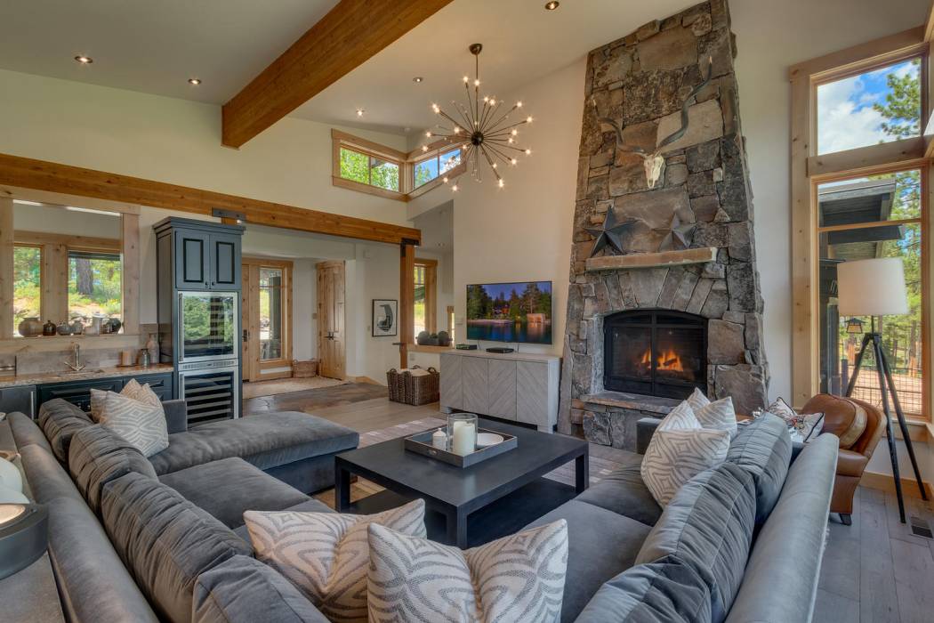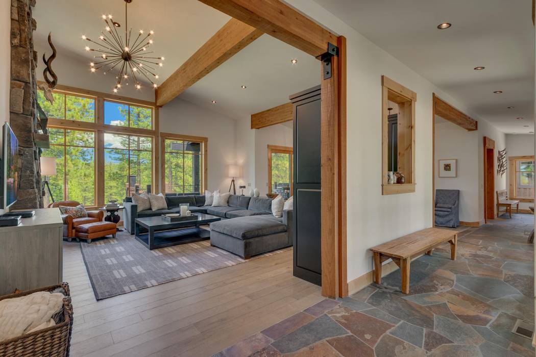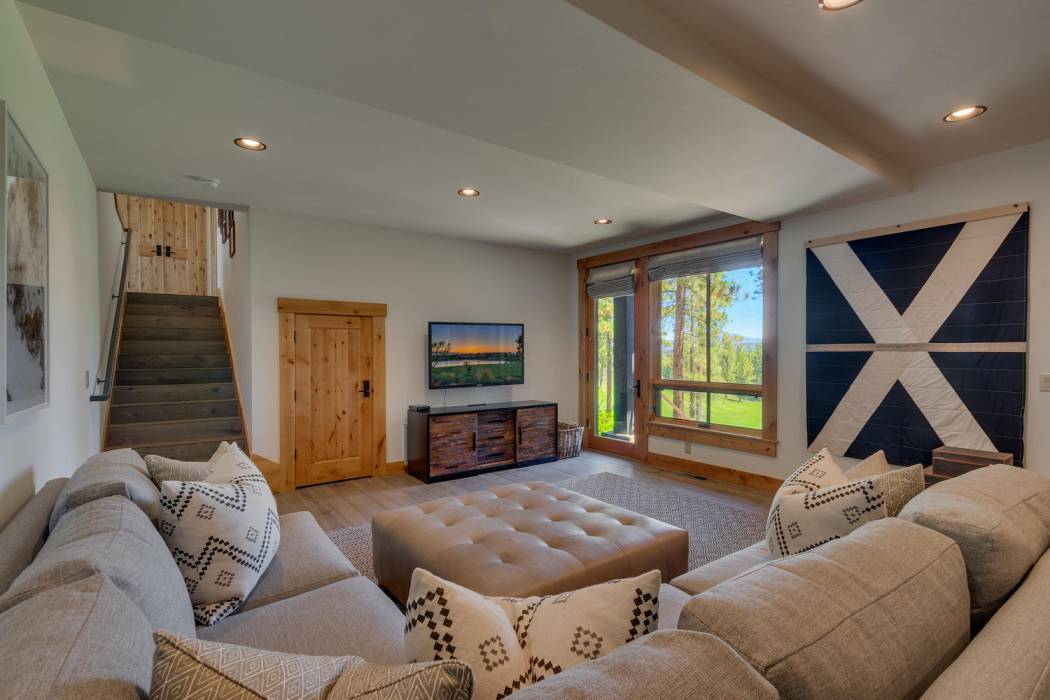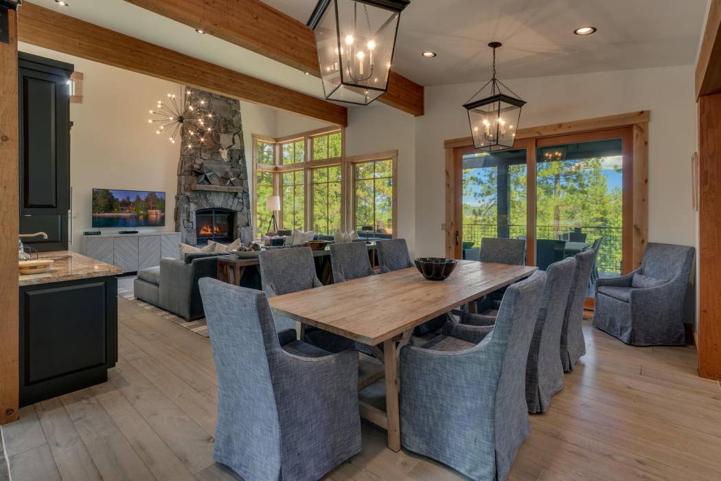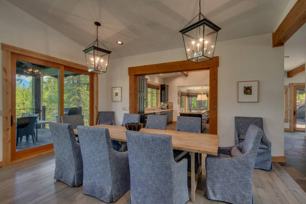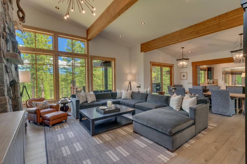 This stunning home, in the Lahontan gated golf community, features breathtaking views of the golf course, mountains, and open space out of every window. The Ward Young-designed home, built by Erhardt Construction, showcases the Old Tahoe style materials with high-end finishes and blends modern design. Large windows bring in abundant sunlight creating a bright and spacious setting.