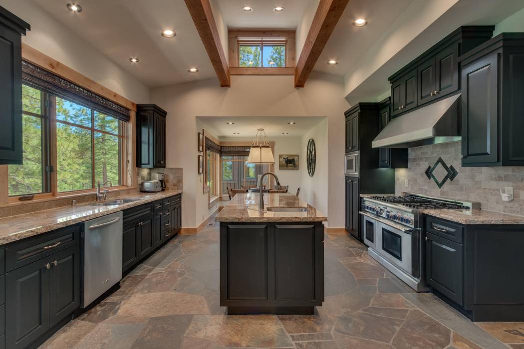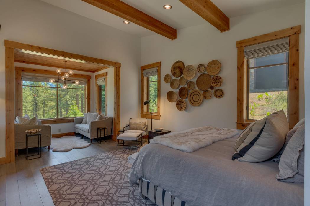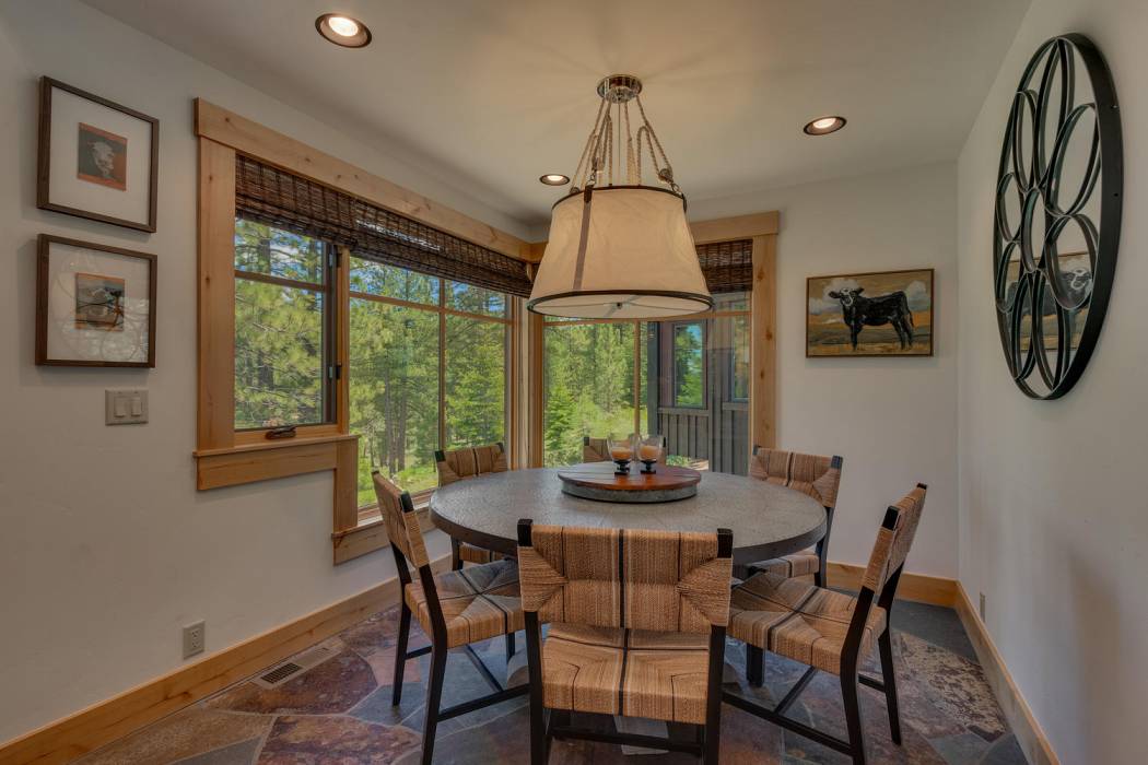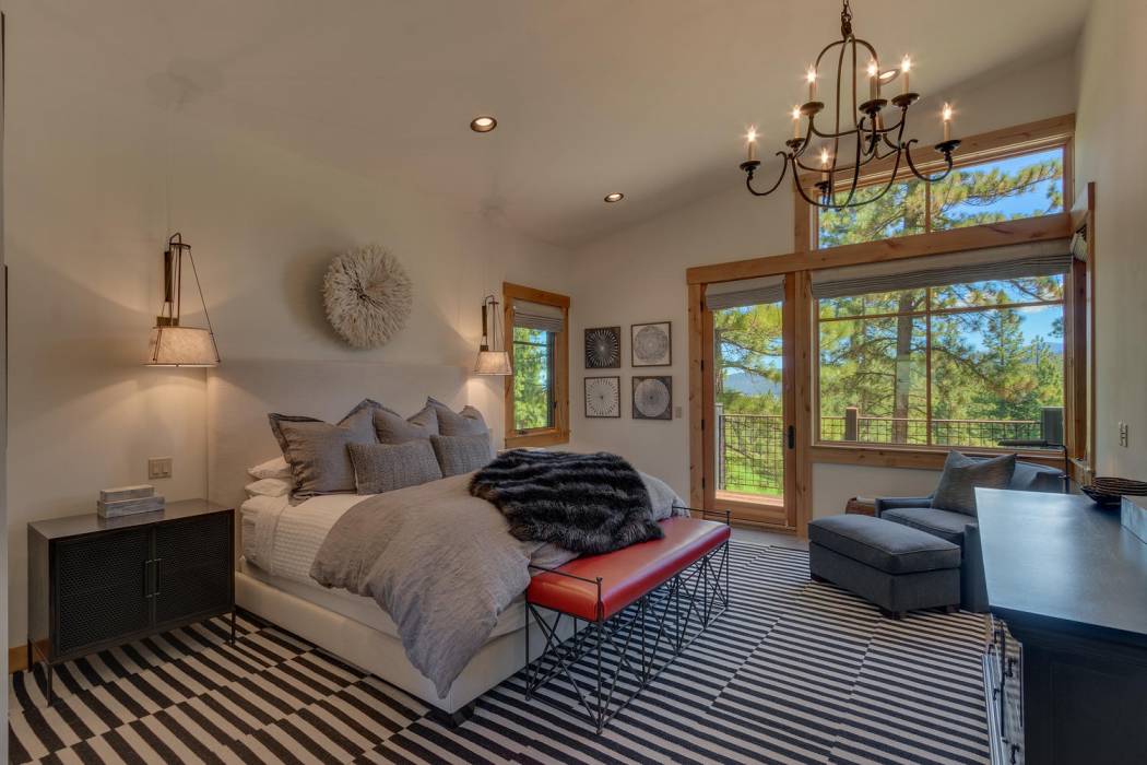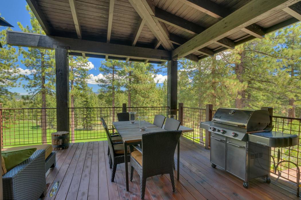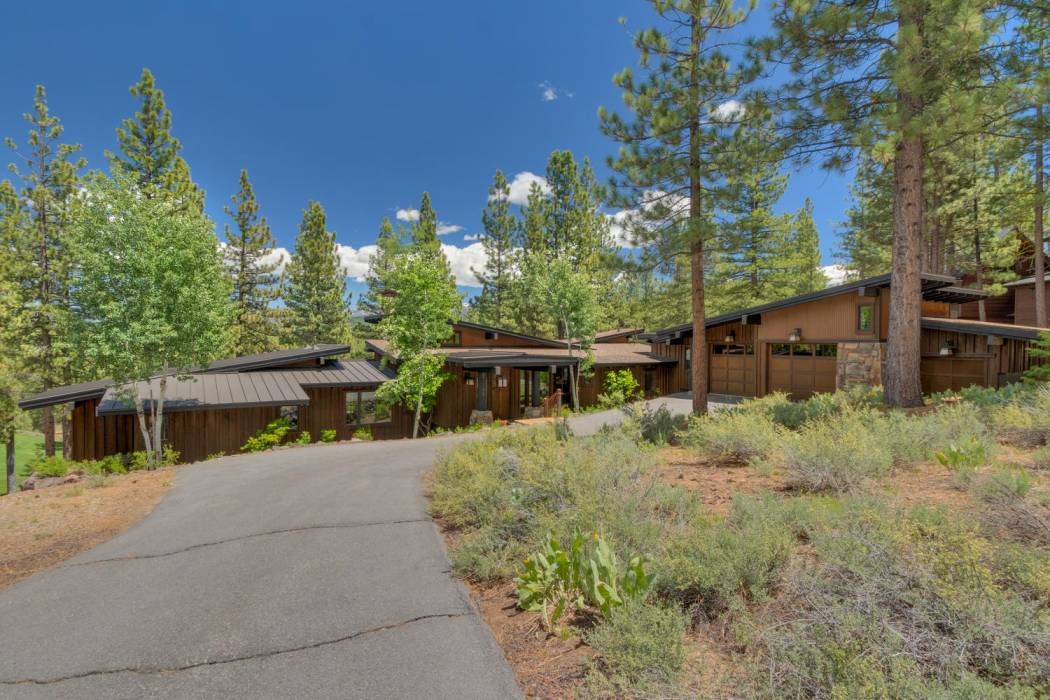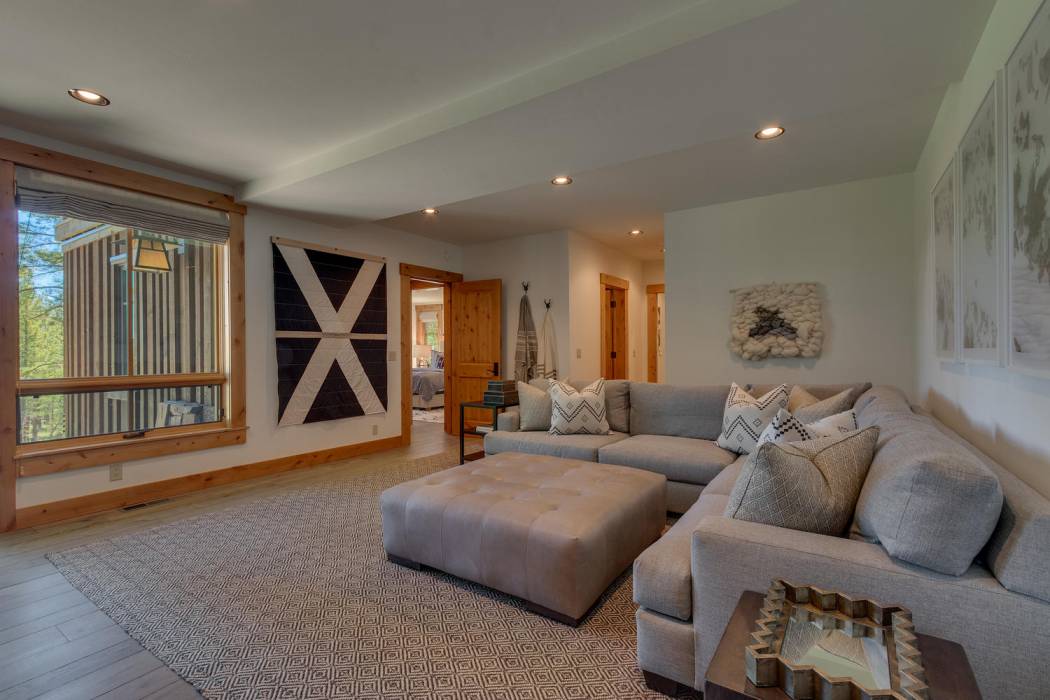 This stunning home, in the Lahontan gated golf community, features breathtaking views of the golf course, mountains, and open space out of every window. The Ward Young-designed home, built by Erhardt Construction, showcases the Old Tahoe style materials with high-end finishes and blends modern design. Large windows bring in abundant sunlight creating a bright and spacious setting.