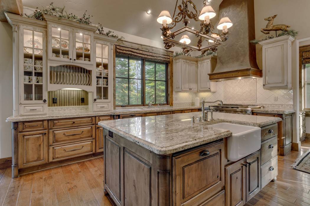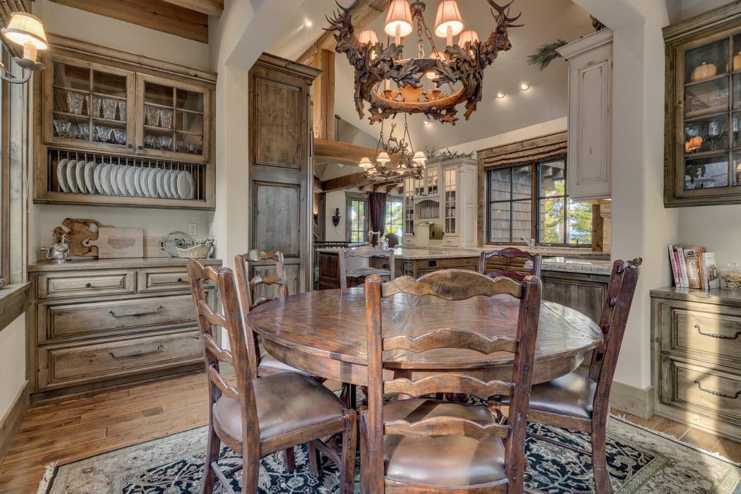 Inside, the home impresses at every turn with grand, oversized living spaces and meticulous custom details like hand-painted walls. The liviing room features a soaring 24-foot trestle-beamed ceiling, massive stone archways, and a striking fireplace that anchors the room with mountain elegance. A gourmet chef’s kitchen, formal and informal dining areas, and a wet bar off the living room creates a seamless atmosphere for elevated living and effortless entertaining.