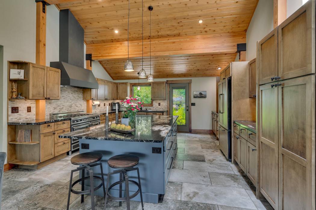 The open-concept main living area offers generous space for a dining table, comfortable sitting area, and bar stools at the spacious kitchen island. With custom cabinetry, wood-paneled appliances, and a clever hideaway cabinet ideal for a coffee station, the kitchen is as functional as it is beautiful. Two skylights and large windows bring natural light into the great room, where a wood-burning fireplace adds warmth and charm.